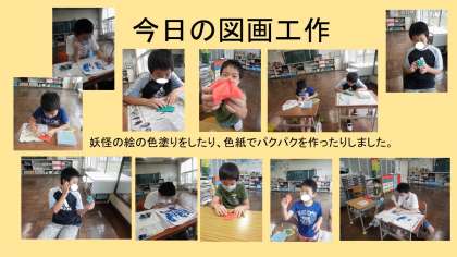 妖怪の絵の色塗りをしました。終わっている子は、折り紙でパクパクを作りました。折り紙が完成したら、楽しそうに遊んでいました。