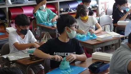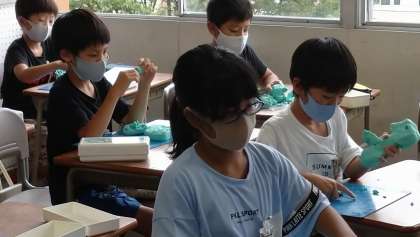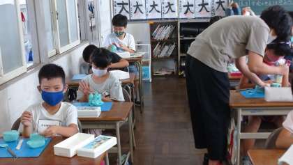 図工の時間に、粘土を使って好きな物を製作しました。粘土を糸を使って切り取り、いくつかをつなげて乗り物や動物を作っていました。みんな、思い思いの制作を、楽しみながら取り組みました。