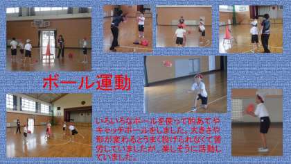 1枚目は体育でボール運動をしている様子です。いろいろなタイプのボールを使って、的あてやキャッチボールをしました。