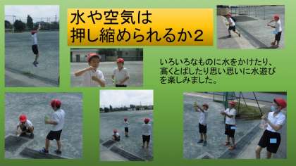 2枚目と3枚目は、生活単元で「空気や水を押し縮めよう」の学習をしているところです。暑いので、水を遠くに飛ばしたり、お互いにかけっこをしたり、いろんなものに水をとばして遊びました。