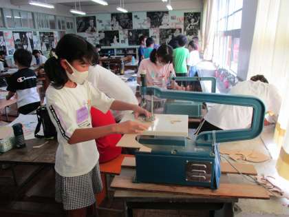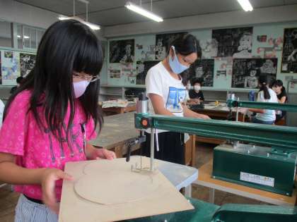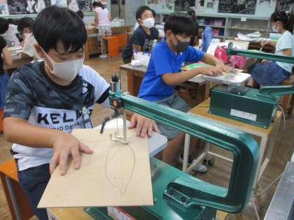 5年生の図工の授業で「電動糸のこぎり」の使い方を学習しています。それぞれの児童が考えた形になるように、初めて電動糸のこぎりを使って作業を進めました。先生から聞いた注意事、項を聞き、初めはおそるおそる作業を進めていた児童でしたが、少しずつコツをつかみ、思い思いの形に仕上げていくことができました。
