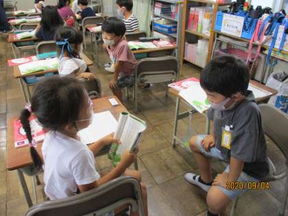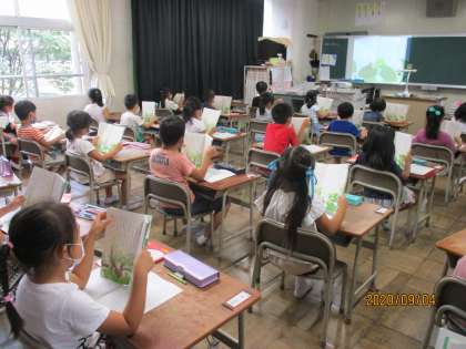 国語「やくそく」を、あおむしさんの気持ちを考えながら音読しました。2場面に出て来るのあおむしさんは、どんな気持ちなのかを読み取り、その気持ちに合った読み方を話し合いました。男の子のあおむしさんと女の子のあおむしさんになって、台詞を言い合いました。