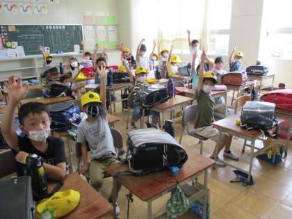 帰りの会で「今週の目標が守れた人は手を挙げてください」と呼びかけると、多くの子たちが手を挙げることができました。がんばっています。