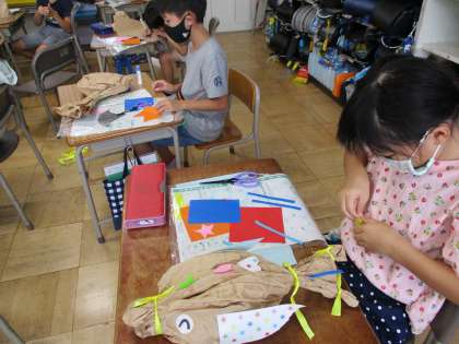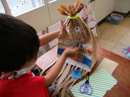 紙の袋を くしゃくしゃ として、見えてきた物を形にしました。思い思いの飾りをつけて完成です。どの子も真剣に取り組んでいます。