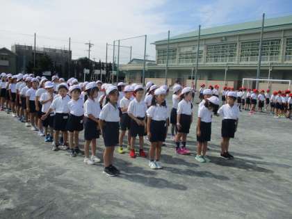 今日は、運動場で徒競走の練習を行いました。並び方、コースの走り方、退場の仕方などを確認しました。本番のように、全員が全力で走る練習もしました。
