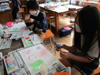 今日は図工で絵の具を使って、モダンテクニックを学びました。スパッタリングやローラー、スタンプなどでさまざまな模様を描きました。初めて学ぶ技法もあり、楽しみながら行うことができました。その技法を使いながら、絵を描くのが楽しみですね。