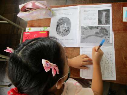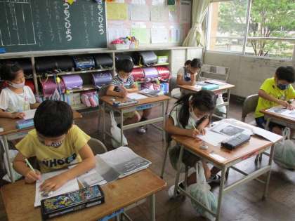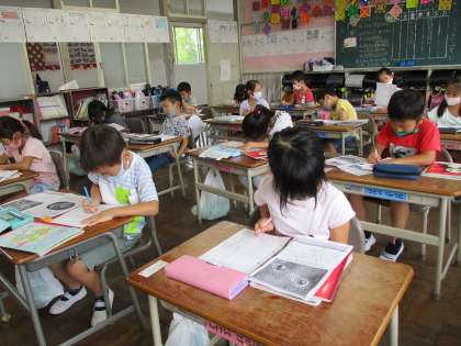 「うみのかくれんぼ」の学習を終えて、海の生き物についての本をたくさん読み、今度は自分たちで海の生き物についての説明カードを書きました。本から読み取った必要なことを自分でまとめてカードにしていきます。難しい学習になるかと思っていましたが、子どもたちは楽しみながら意欲的に取り組むことができました。
