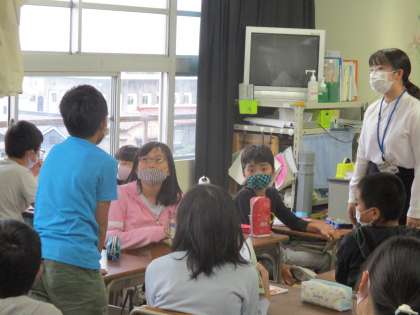 先週から学校へ来ていた教育実習の先生が授業をしました。英語では「道案内の仕方」や算数では「分数のたし算ひき算」の授業を展開し、子どもたちの様子をよく見ながら楽しそうに活動をしていました。子どもたちは授業が終わってからもたくさん話しかけに行ったり、質問をしたりする姿がたくさん見られました。
