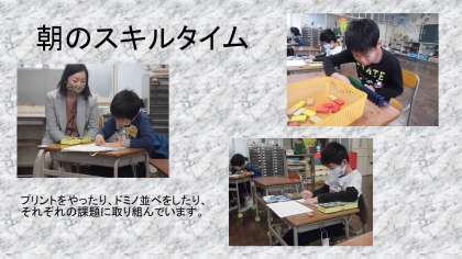 朝のスキルタイムは、個々に応じたプリントやドミノ倒しなどを行っています。