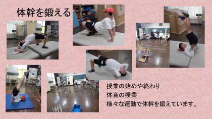 授業の始めや終わり・体育の授業では、体幹を鍛えることを意識した活動を多く入れています。体幹を鍛えることで姿勢保持ができるようになり、学習にも集中することが期待できます。
