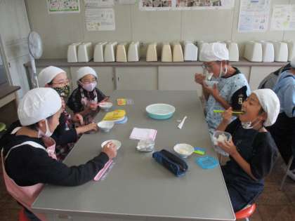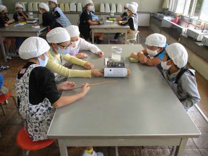 家庭科の授業でごはんを炊きました。お米がごはんになる様子をしっかり観察するためにガラスの容器を使って実習を行いました。子どもたちはお米がだんだん立ち上がって、おどりながらごはんになっていく様子を初めて見て、歓声をあげています。炊きあがったごはんを実際に食べてみて、いつものごはんとの違いを感じることができました。