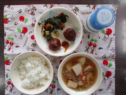 さといも、にんじん、しいたけ、油揚げなどを油でいため、だしで煮ます。