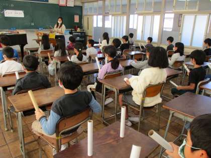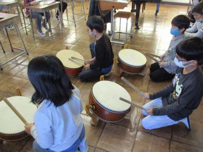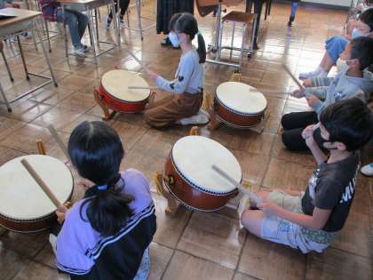 音楽では太鼓の練習をしています。最初はラップの芯で練習し、その後太鼓でも練習しました。ソーラン節のリズムに合わせて、太鼓をたたくことができました。これからだんだん難しいリズムにも挑戦していきます。
