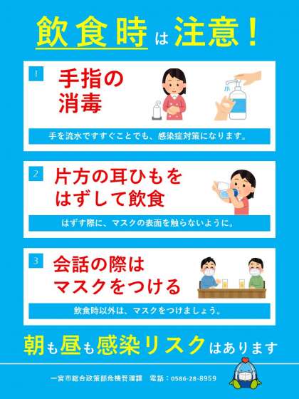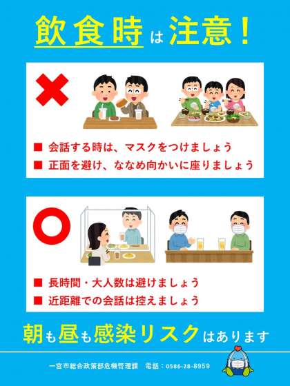 たとえ少人数での朝食や昼食や夕食であっても飛沫による感染のリスクを軽減するためにも上記のように取り組んでいただけると幸いです。