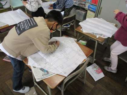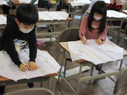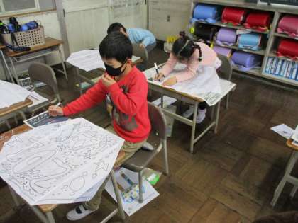 昔遊びの中で「凧作り」を始めました。どのような絵にしようか考え、今日は下絵を凧にかきました。大きく大きくかくことができました。次は色をつけていきます。完成するのがとても楽しみです!