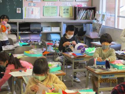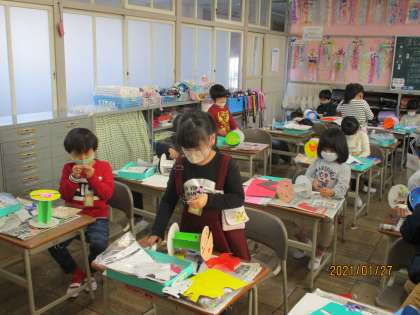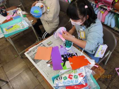 ころころ転がると面白い仕掛けを考えました。折り紙や厚紙を切って貼ったり、色ペンを使って模様を描いたりして、楽しく取り組みました。