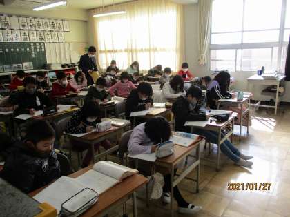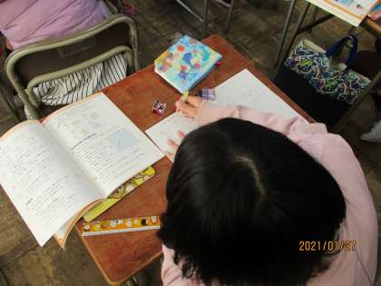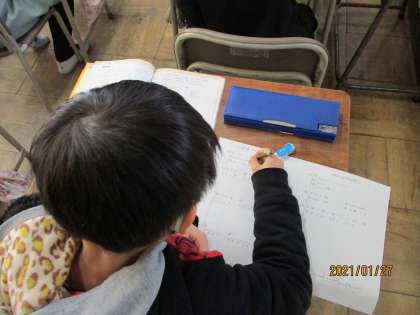 算数の復習問題に取り組みました。小数の足し算や引き算、かけ算やわり算など、これまで学んだことを確かめていきました。