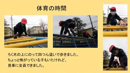体育では、長縄跳びをしたり、遊具を使って様々な体験活動をしました。