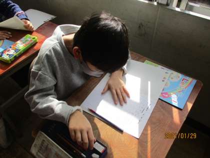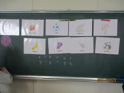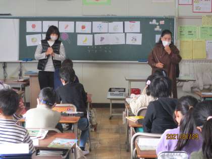 外国語活動では、「What's this?」や「It's a〜」の表現を学習しました。3つのヒントを英語で出し、ヒントからわかった答えを英語で答える活動に楽しく取り組んでいました。この1年で発音もよくなってきました。
