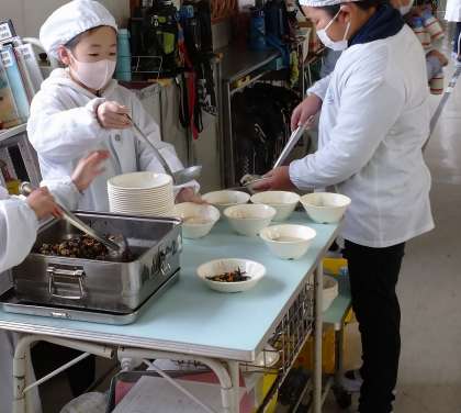 給食の時間に、係の仕事に取り組んでいます。お皿の数を数えたり、盛り付ける量に気をつけたりと、自分の役割にきちんと取り組もうとする姿に感心します。関わったすべての方に感謝して、バランスよくいただきましょう。
