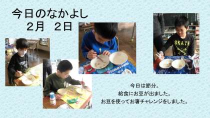 給食前にその「いり豆」を使って「お箸チャレンジ」をしました。