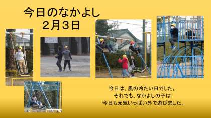 今日は、北風の冷たい日でしたが、なかよしの子は休み時間になると一直線に運動場に走っていきます。思い切り外で遊んで、室内では勉強に集中しています。