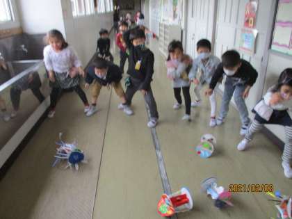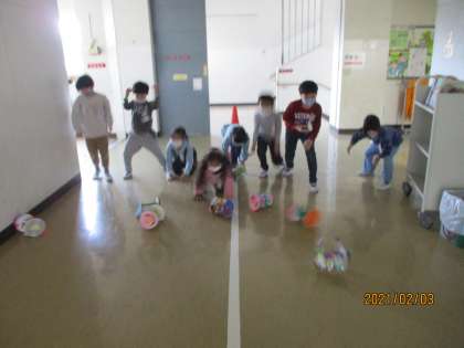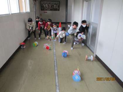 廊下に出て、転がし競争!みんな上手に転がしました。