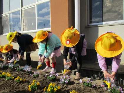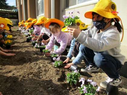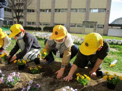 中庭の学年園にビオラの花を植えました。新1年生が学校に来るころには、花壇にいっぱいの花たちが咲いてくれるはずです。様子を観察しながら、大切に育てていきたいと思います。