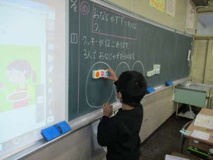 12このクッキーを3人で分ける問題を考えました。どのようにわけたらよいのか式や数図ブロックを使って様々な方法を考えることができました。