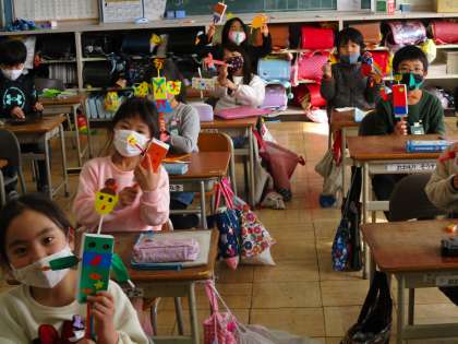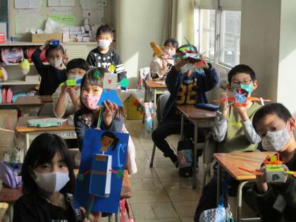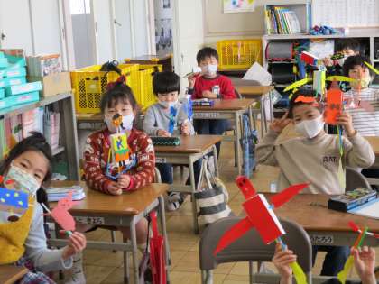 図工では、ストローを利用して動くおもちゃ作りを行っています。ストローを動かすと翼が羽ばたいたり、首がのびたり、足が動いたりします。子どもたちは、動きから想像できるものを作ることができました。完成後も楽しそうに遊んでいる姿が見られました。