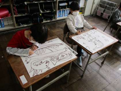 自分が乗ってみたいものにのって、行ってみたい場所へ!というテーマで絵を描いています。自分の好きなものに囲まれてとても素敵な幸せな絵になっています。これから、色付けをしていきます。どんな世界が出来上がるのかとても楽しみです。