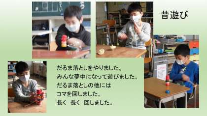 今日は、昔遊びをしました。子供達が一番熱中したのは「だるま落とし」でした。