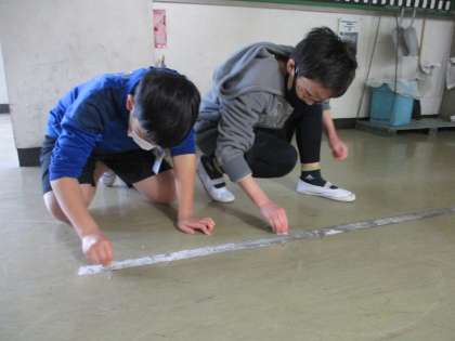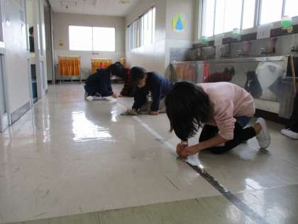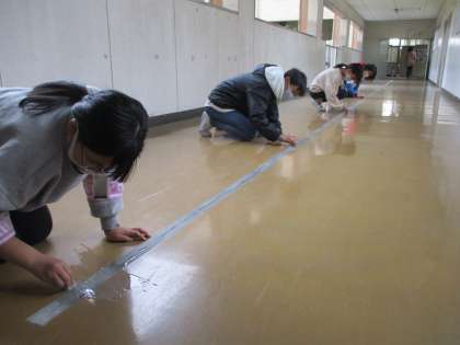 廊下担当の子は、日頃の清掃に加えて白線の汚れをきれいに落としています。