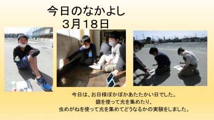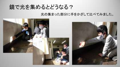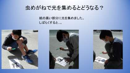鏡や虫めがねを使って、日光を集めました。