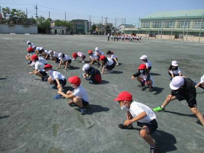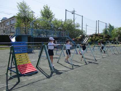 体育係の号令のもと、準備運動をしてから、前回りと逆上がりができるのか、試しにやってみました。久しぶりの鉄棒で、おなかが押されたからおなかがすぐ空いた!なんて話す子や、逆上がりが一回はできた!と喜んでいる子もいました。