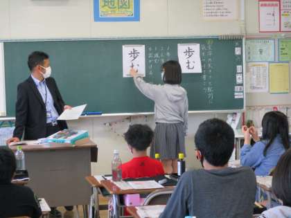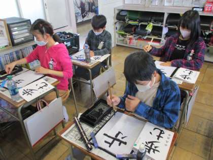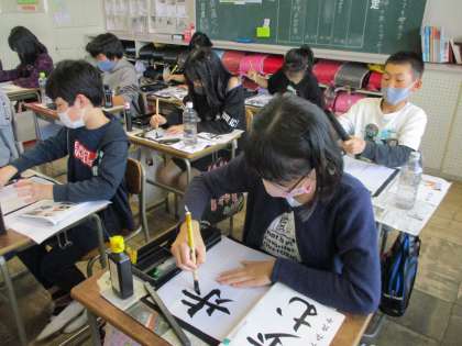 書写の授業で「歩む」という文字を練習しました。これまでの毛筆の学習をいかして、文字を書くポイントを全員で確認し、集中して取り組むことができました。