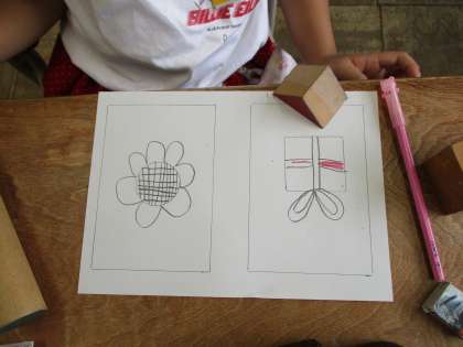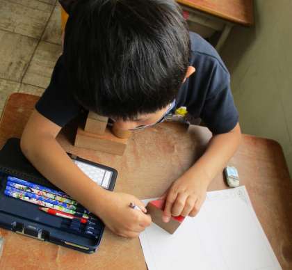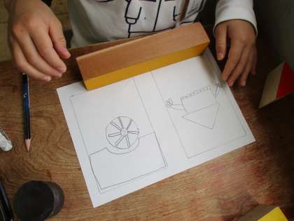 積み木を使って、形をうつして絵をかきました。積み木に沿って、丁寧に形をうつしとりました。