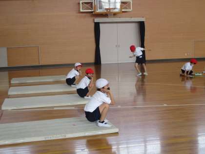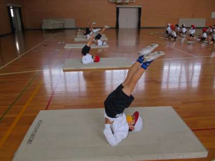 屋内運動場では、マットあそびをしています。前転がり、後ろ転がり、アンテナ、川とびなどを練習しています。初めの頃に比べると、いろいろな技が上手にできるようになってきました。