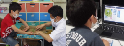 組み立てブロックで、オリジナルのキャラクターを作り、モーターをつけて、自律歩行をできるようにしました。