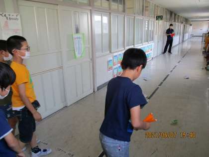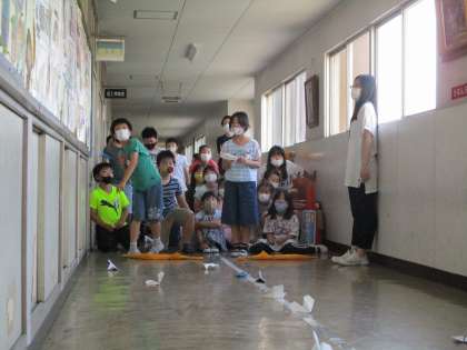 それぞれに紙飛行機を作り、紙飛行機を飛ばしました。