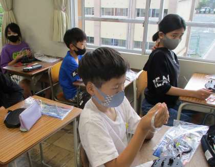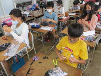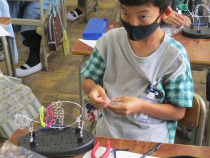 針金をひねったり切ったりして、ワイヤーアートを作っています。オリジナルの生き物や模様を工夫して作っています。様々なアイデアが見られています。完成が楽しみです。