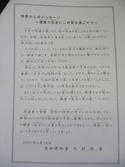 6.22 熱中症予防に向けて知事からのメッセージ 公開日 2021/06/22 更新日 2021/06/22 学校ニュ−ス 知事からのメッセージです。 熱中症は大変危険です。みんなで気を付けていきましょう。