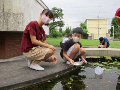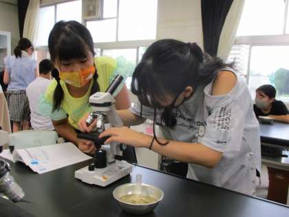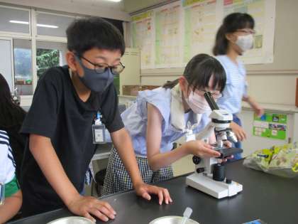 理科の学習で食べ物を通して生物どうしがどのように関わっているのかについて、学習しています。その一環でメダカが何を食べているのかを調べるために、希望の泉で採取した水の中にいる生物を顕微鏡を使って観察しました。ミジンコやボルボックスなど教科書にのっている写真と同じ生物が見えると、うれしそうにノートにスケッチをして記録に残していました。
