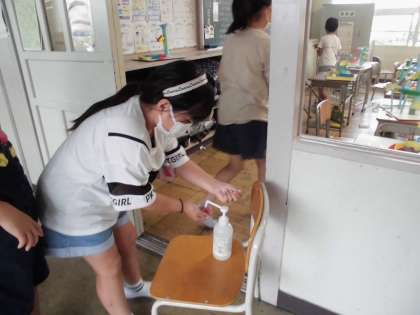 教室を鑑賞会場にして、入室する前はしかっりと手指消毒です。グループごとに分かれて密にならないように鑑賞しました。