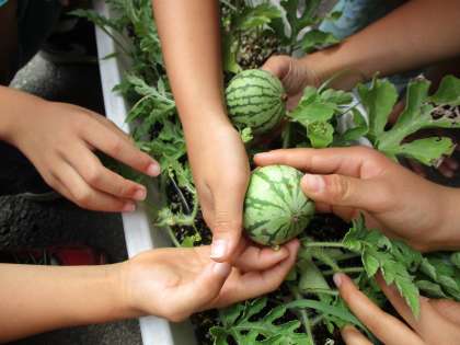 赤ちゃんスイカを観察しました。6月4日に種をまいたスイカですが、こんなにかわいく実ってきました。