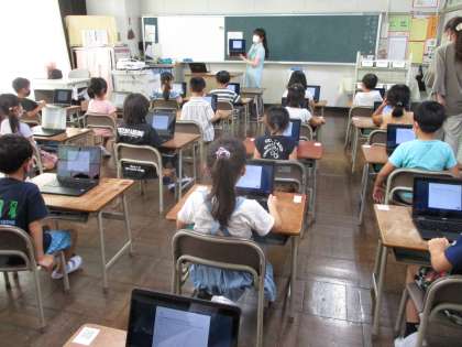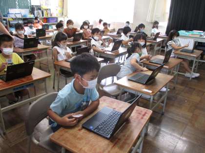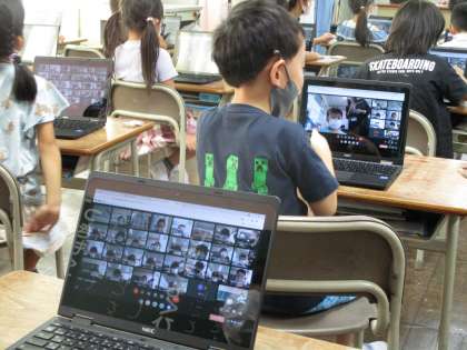 クロームブックへのログインを行った後、グーグルクラスルームの使い方を行いました。クラスルーム内のリンクをタッチして、向山小学校のウェブページを見たり、ミートを使ってテレビ電話のように画面上でみんなが顔を合わせたりしました。一人一人がとても嬉しそうにいろいろな操作を行うことができました。