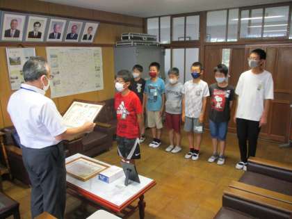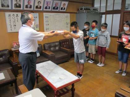 夏休み中に行われた一宮学童軟式野球大会のAの部で、向山小学校の少年野球クラブが第3位に輝いたので、校長室で表彰式を行いました。少年野球クラブを代表して6年生のメンバーが集まり、校長先生から表彰状や記念品などを授与されました。これまでの多くの努力がすばらしい結果につながったんでしょう。ぜひ野球で得た経験をこれからの学校生活でもいかしてもらいたいです。