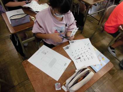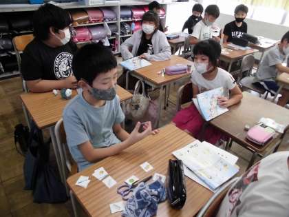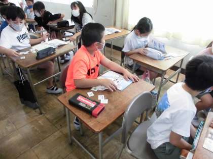 先週までに習った文房具カードを使って、オリジナルの文房具セットを作りました。友達が作った文房具セットを「Do you have〜?」「Yes,I do」「No,I don't」の言葉を使って相手の文房具セットを完成させるゲームをしました。