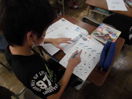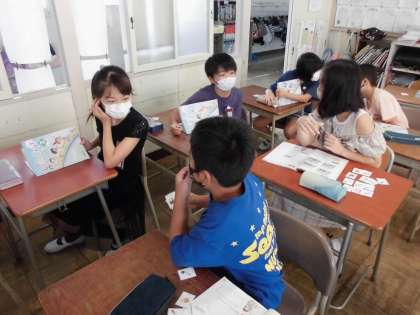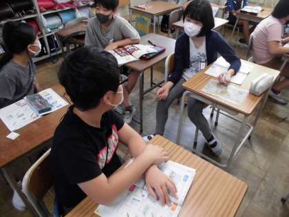 オリジナルの文房具セットを作ってどんな文房具を入れたか尋ねあいました。授業の最後にはペアの友達に向けて喜んでもらえるような文房具セットを作りました。