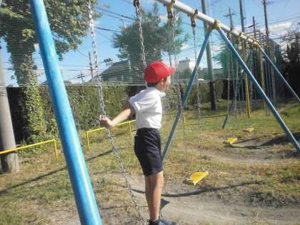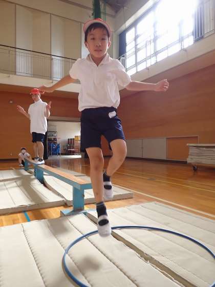 体育館では平均台、運動場ではボール投げ、転がしドッジ、遊具遊びをしました。